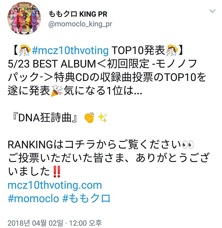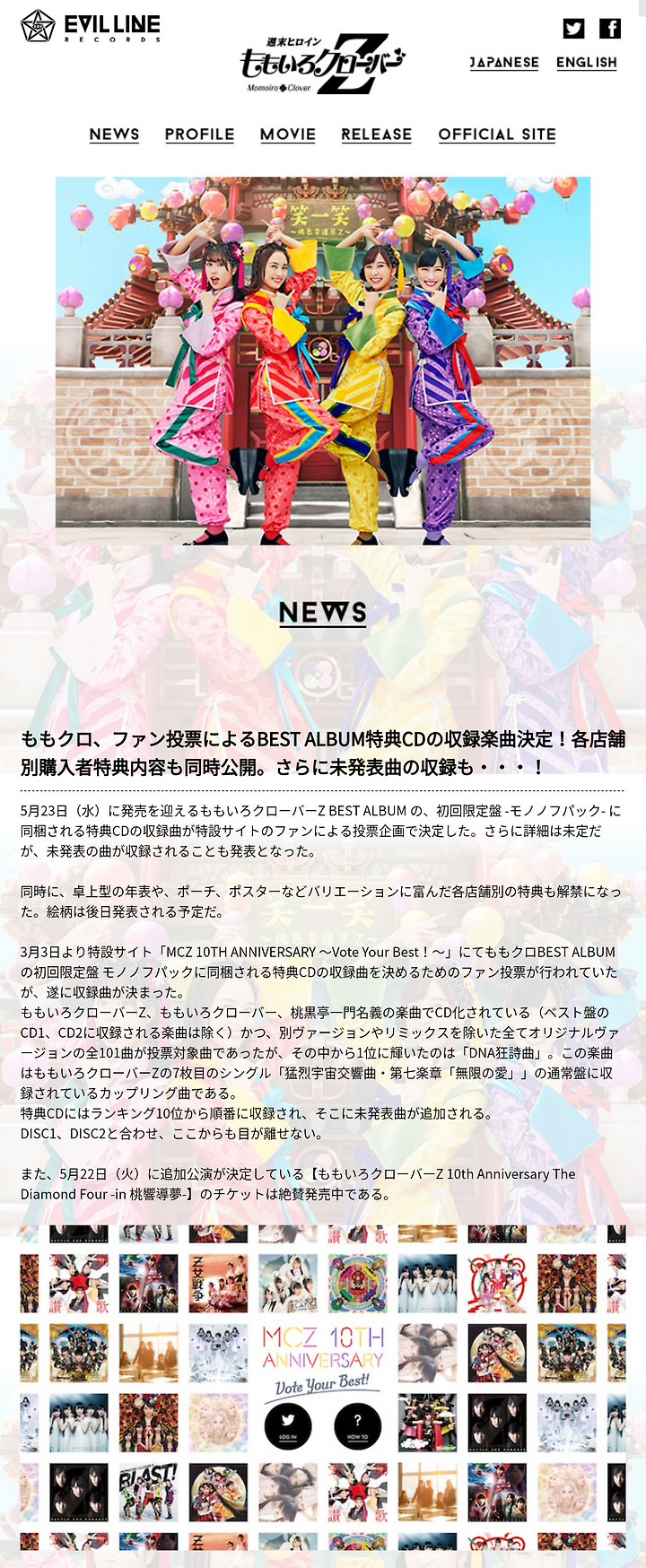 아이돌 그룹·모모이로 클로버 Z의 첫 베스트 앨범 『 모모이로 클로버 Z 10주년 기념 BEST ALBUM(가제)』(5월 23일 발매)의 초회 한정반 모노노후팩에 동봉되는 특전 CD의 수록곡이 발표됐다.