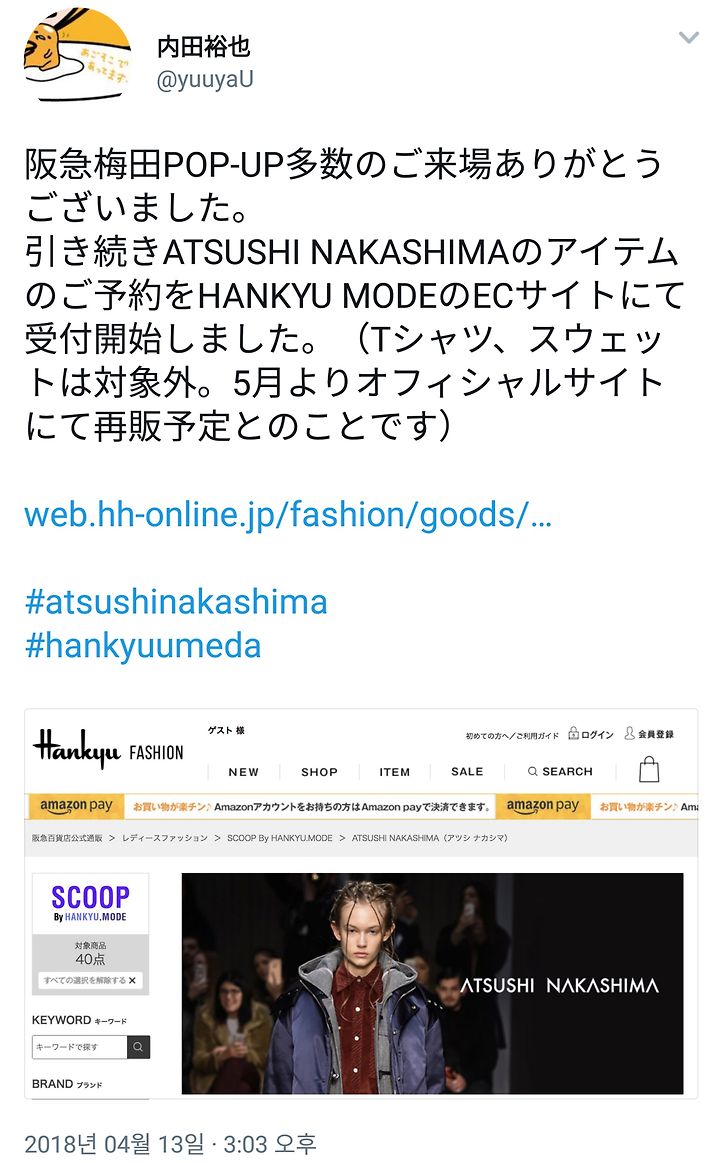 계속해서 ATSUSHI NAKASHIMA 아이템의 예약을 HANKYU MODE의 EC사이트에서 접수 개시했습니다.(T셔츠, 스웨트는 대상 외. 5월부터 오피셜 사이트에서 재판매 예정입니다)