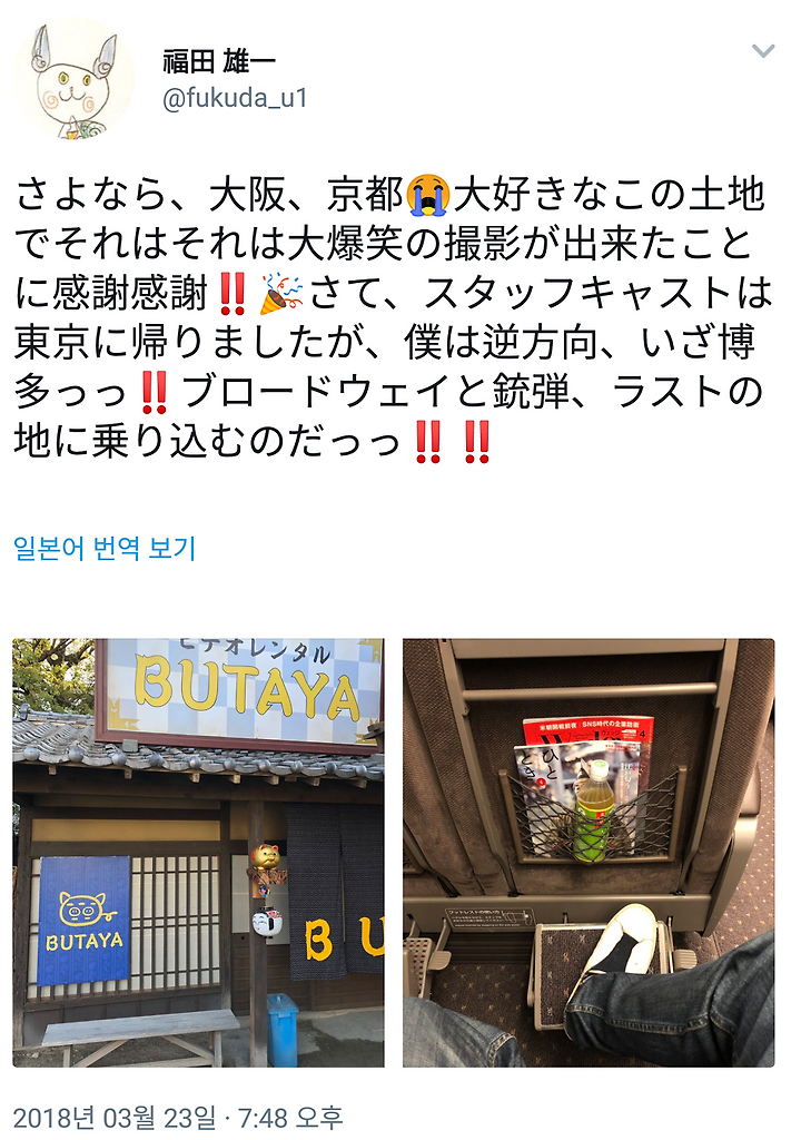 さよなら、大阪、京都😭大好きなこの土地でそれはそれは大爆笑の撮影が出来たことに感謝感謝‼️🎉さて、スタッフキャストは東京に帰りましたが、僕は逆方向、いざ博多っっ‼️ブロードウェイと銃弾、ラストの地に乗り込むのだっっ‼️‼️ https://t.co/EeMdKZFJYp
