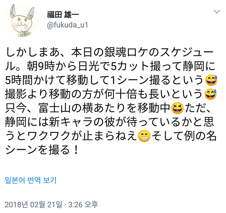 하지만 뭐, 오늘 은혼 로케 스케쥴. 아침 9시부터 햇빛에 5컷 찍고 시즈오카에 5시간 동안 이동하고 1씬 찍는다고 하는 😅 촬영보다 이동이 수십배나 길다고 하는. 지금 후지 산 옆 근처를 이동 중 😆 다만 시즈오카에는 새로운 캐릭터의 그가 기다리고 있다고 생각하니 설레임이 멈추질 않네 😁 그리고 항례의 명씬을 찍자!