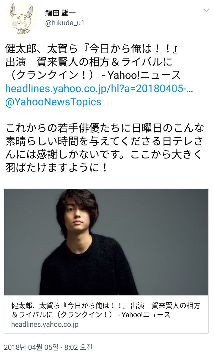 켄타로, 타이가들 『 오늘부터 나는!!』 출연. 카쿠 켄토의 파트너 & 라이벌에 (크랭크 인!)-Yahoo!소식 https://t.co/crOFeHfOvQ@YahooNewsTopics