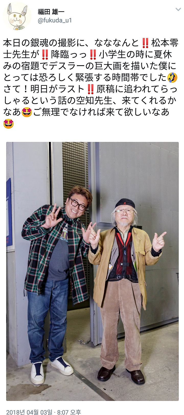 本日の銀魂の撮影に、なななんと‼️松本零士先生が‼️降臨っっ‼️小学生の時に夏休みの宿題でデスラーの巨大画を描いた僕にとっては恐ろしく緊張する時間帯でした🤣さて!明日がラスト‼️原稿に追われてらっしゃるという話の空知先生、来てくれるかなあ🤩ご無理でなければ来て欲しいなあ🤩 https://t.co/Q9iy4ptTuh