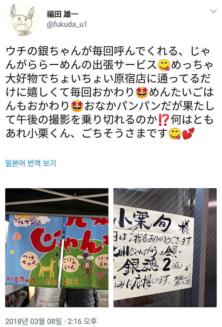 ウチの銀ちゃんが毎回呼んでくれる、じゃんがららーめんの出張サービス😋めっちゃ大好物でちょいちょい原宿店に通ってるだけに嬉しくて毎回おかわり🤩めんたいごはんもおかわり🤩おなかパンパンだが果たして午後の撮影を乗り切れるのか⁉️何はともあれ小栗くん、ごちそうさまです😋💕 https://t.co/O5wWidE4Gg