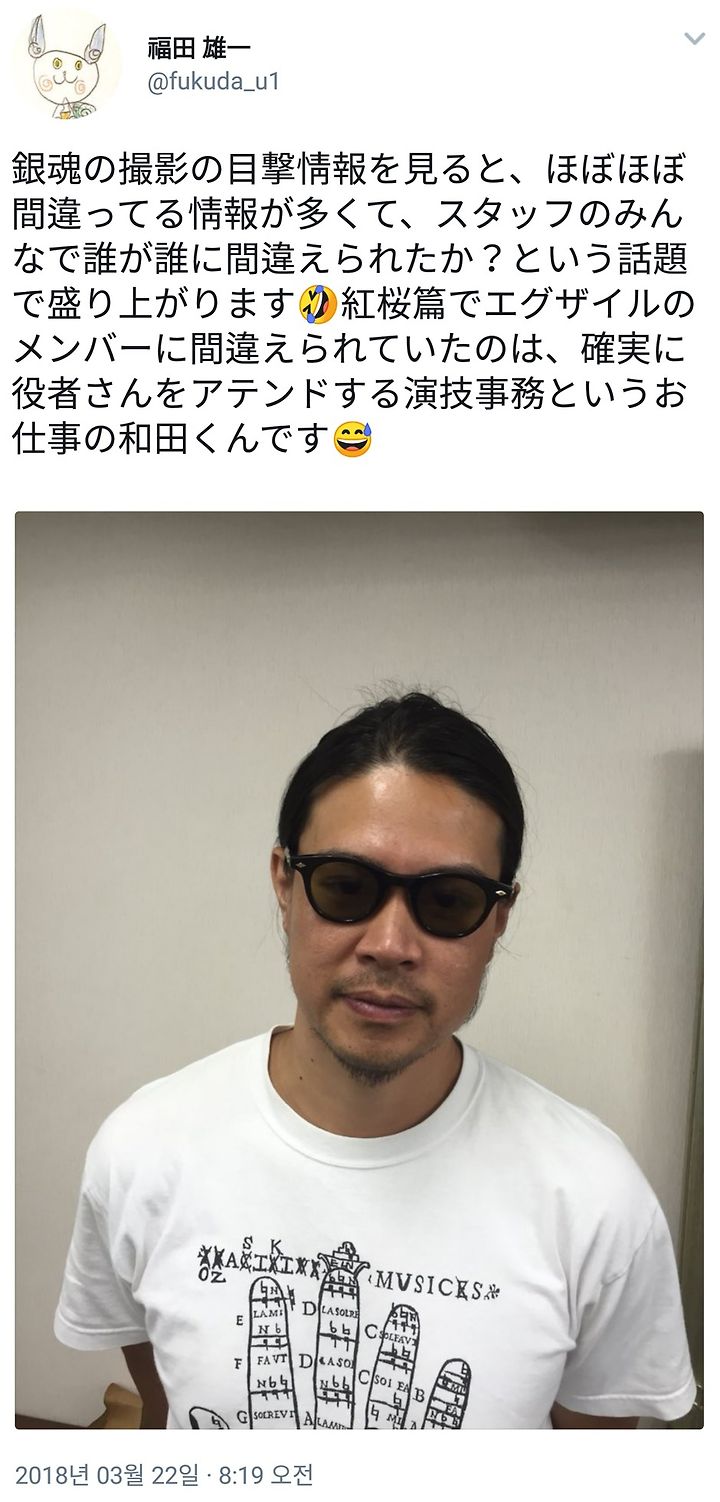 銀魂の撮影の目撃情報を見ると、ほぼほぼ間違ってる情報が多くて、スタッフのみんなで誰が誰に間違えられたか?という話題で盛り上がります🤣紅桜篇でエグザイルのメンバーに間違えられていたのは、確実に役者さんをアテンドする演技事務というお仕事の和田くんです😅 https://t.co/UlgmveZhyf
