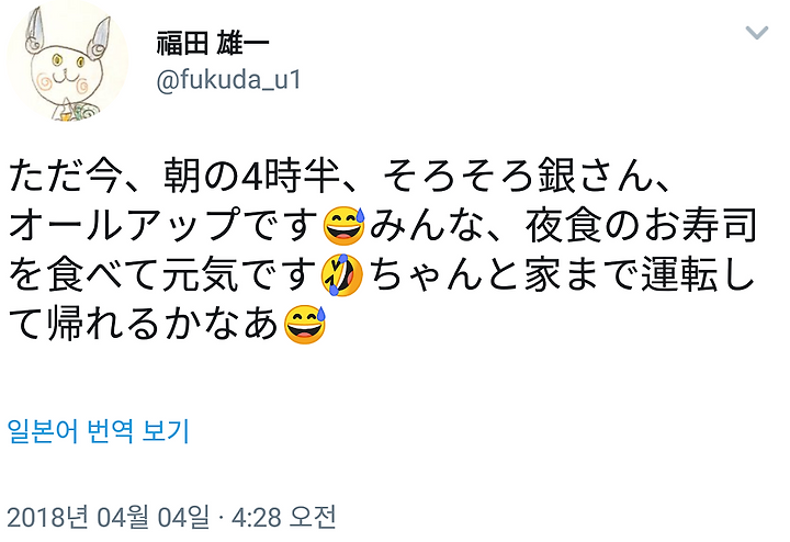 ただ今、朝の4時半、そろそろ銀さん、オールアップです😅みんな、夜食のお寿司を食べて元気です🤣ちゃんと家まで運転して帰れるかなあ😅