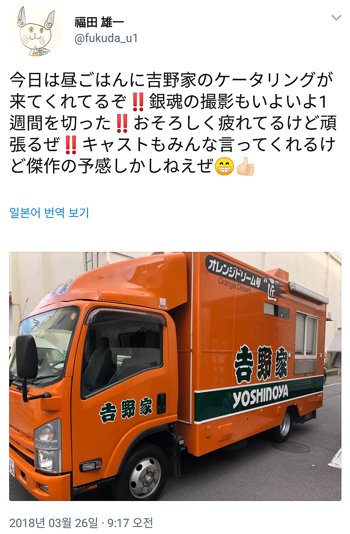 今日は昼ごはんに吉野家のケータリングが来てくれてるぞ‼️銀魂の撮影もいよいよ1週間を切った‼️おそろしく疲れてるけど頑張るぜ‼️キャストもみんな言ってくれるけど傑作の予感しかしねえぜ😁👍🏻 https://t.co/MMdkd9DA6o