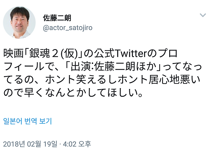 영화 "은혼2(가)" 의 공식 트위터 프로필에 "출연: 사토지로 외" 라고 되어 있는거 정말 웃음나고 정말 마음 불편하기 때문에 빨리 어떻게든 해줬으면 좋겠어