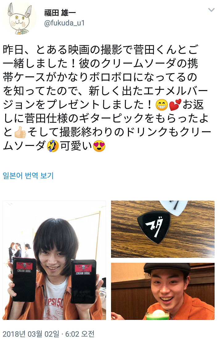 어제 어떤 영화의 촬영에서 스다군과 함께 했습니다! 그의 크림 소다 휴대 케이스가 너무 너덜너덜 되있는 것을 알고 있었기 때문에 새로 나온 에나멜 버전을 선물했습니다!😁💕 답례로 스다 사양 기타 피크를 받았어요 👍 그리고 촬영 끝의 음료도 크림 소다 귀엽😍 https://t.co/Rjk0HkNXfU