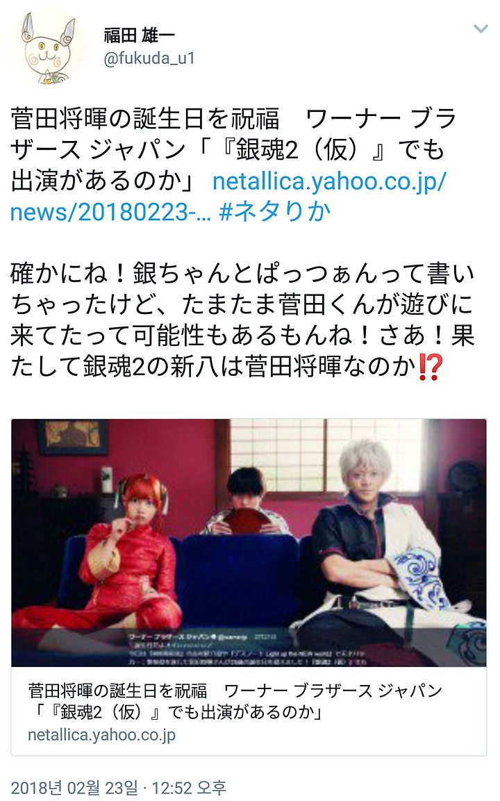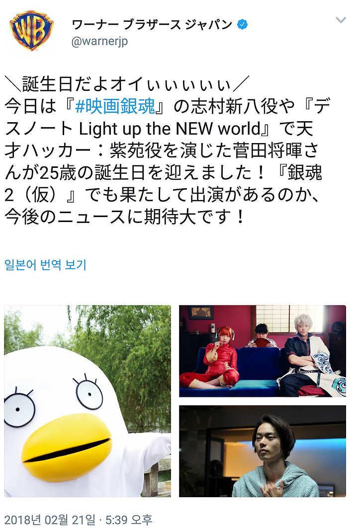 菅田将暉の誕生日を祝福 ワーナー ブラザース ジャパン「『銀魂2(仮)』でも出演があるのか」