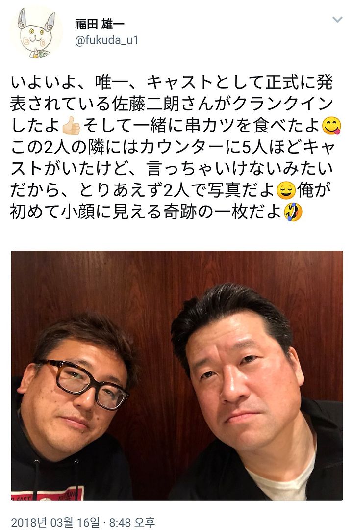 いよいよ、唯一、キャストとして正式に発表されている佐藤二朗さんがクランクインしたよ👍🏻そして一緒に串カツを食べたよ😋この2人の隣にはカウンターに5人ほどキャストがいたけど、言っちゃいけないみたいだから、とりあえず2人で写真だよ😌俺が初めて小顔に見える奇跡の一枚だよ🤣 https://t.co/f4ijCRs9ue