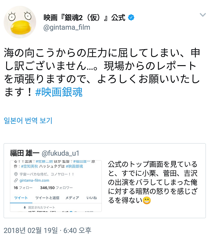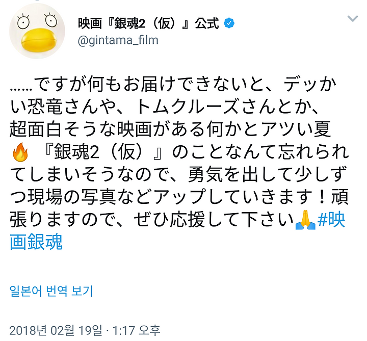 海の向こうからの圧力に屈してしまい、申し訳ございません…。現場からのレポートを頑張りますので、よろしくお願いいたします!#映画銀魂 https://t.co/lK1cEvRmxQ