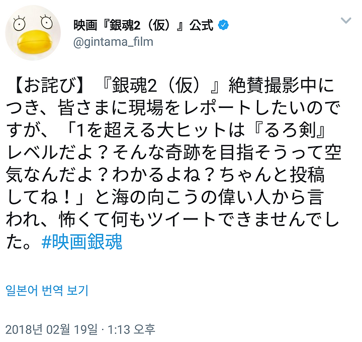 【お詫び】『銀魂2(仮)』絶賛撮影中につき、皆さまに現場をレポートしたいのですが、「1を超える大ヒットは『るろ剣』レベルだよ?そんな奇跡を目指そうって空気なんだよ?わかるよね?ちゃんと投稿してね!」と海の向こうの偉い人から言われ、怖くて何もツイートできませんでした。#映画銀魂