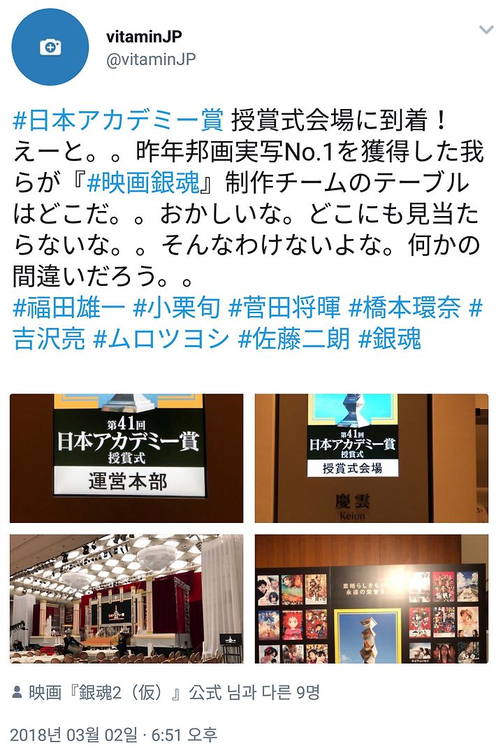 #일본 아카데미상 시상식장에 도착! 음.. 지난해 국내 영화 실사 No.1을 획득한 우리의 『#영화 은혼 』 제작팀의 테이블은 어디냐?. 이상하네. 어디에도 보이지 않는다... 그럴 리가 없겠지. 뭔가 실수한거겠지.
