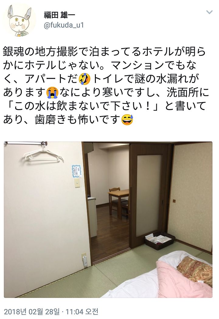 은혼의 지방 촬영에서 머무는 호텔이 분명히 호텔이 아닌. 맨션도 아니고 아파트다 🤣 화장실에서 수수께끼의 누수가 있습니다 �� 무엇보다 춥고 세면소에 "이 물은 마시지 마세요!"라고 써있어서 양치도 무섭습니다 😅 https://t.co/YeSTUCsUbA