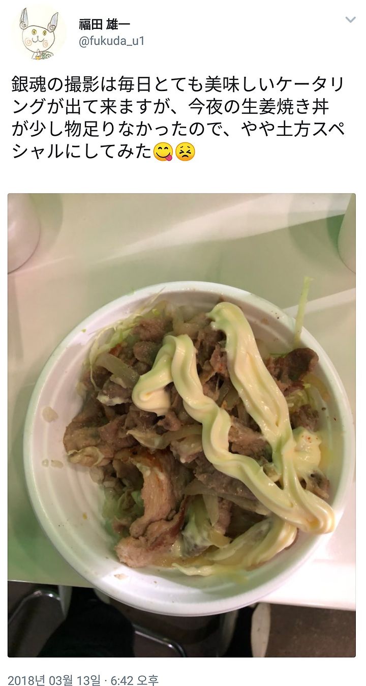 은혼 촬영은 매일 매우 맛잇는 케이터링이 오고 있습니다만, 오늘밤 쇼가야키동이 조금 부족했기 때문에 살짝 히지카타 스페셜(=마요네즈)로 해본