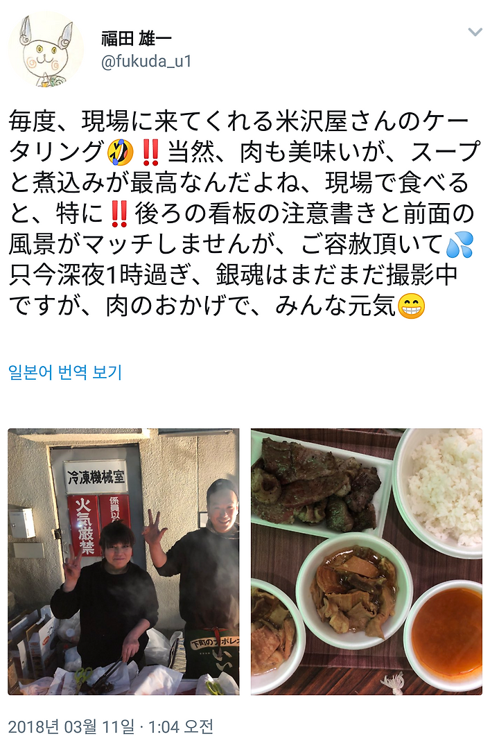 매번 현장에 와주시는 요네자와상의 케이터링! 당연히 고기도 맛있습니다만 스프와 찜이 최고네. 현장에서 먹으면 특히 ‼ ️ 뒤의 간판의 주의서와 전면의 풍경이 매치되지 않지만, 용서해주셨음 지금 밤 1시 지났고 은혼은 아직 촬영 중입니다만, 고기 덕분에 모두 겡끼😁