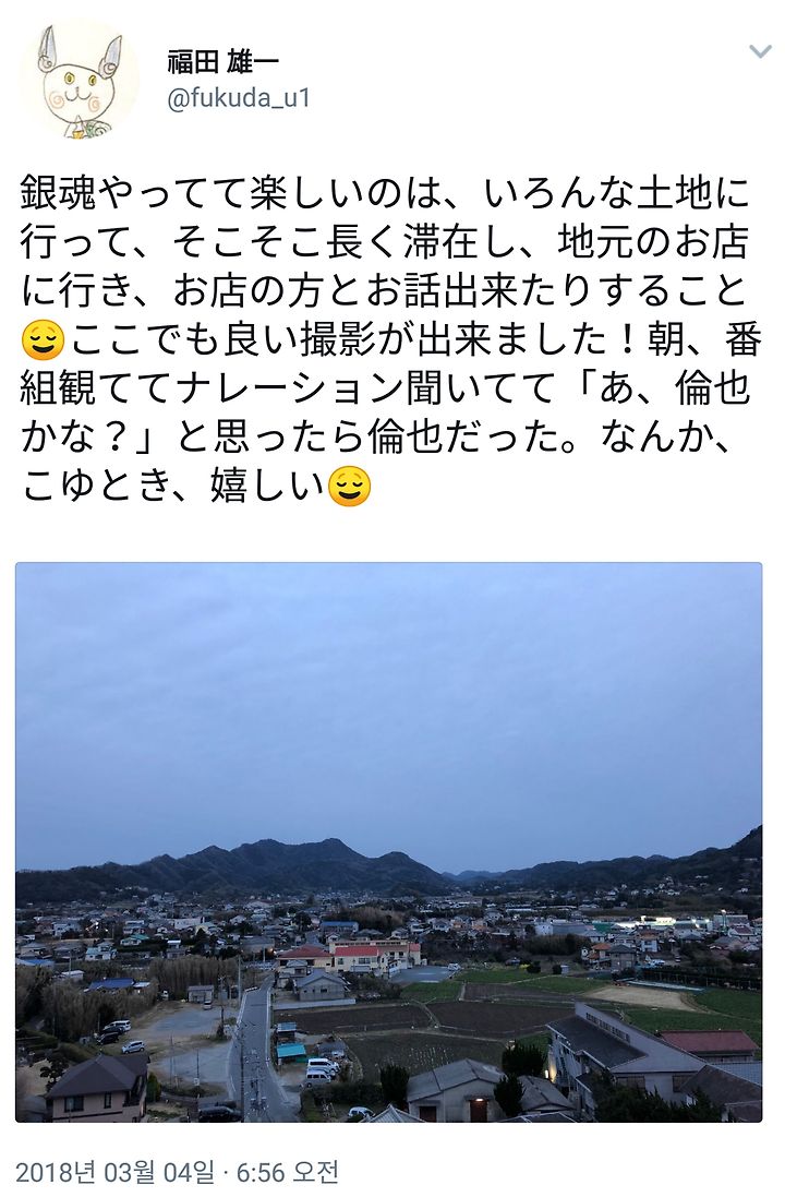 銀魂やってて楽しいのは、いろんな土地に行って、そこそこ長く滞在し、地元のお店に行き、お店の方とお話出来たりすること😌ここでも良い撮影が出来ました!朝、番組観ててナレーション聞いてて「あ、倫也かな?」と思ったら倫也だった。なんか、こゆとき、嬉しい😌 https://t.co/dI23GfdQ3Y