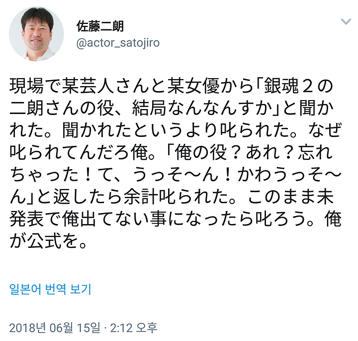 現場で某芸人さんと某女優から「銀魂2の二朗さんの役、結局なんなんすか」と聞かれた。聞かれたというより叱られた。なぜ叱られてんだろ俺。「俺の役?あれ?忘れちゃった!て、うっそ〜ん!かわうっそ〜ん」と返したら余計叱られた。このまま未発表で俺出てない事になったら叱ろう。俺が公式を。