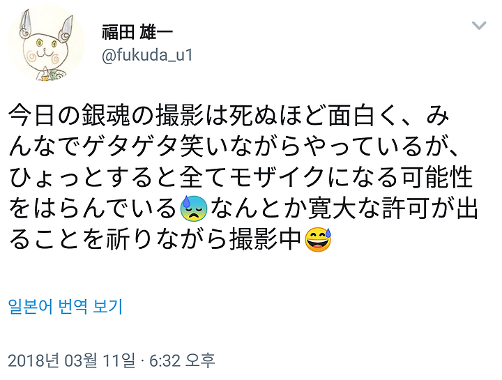 오늘 은혼의 촬영은 죽을 만큼 재미 있어서, 모두 깔깔 웃으면서 하고 있는데, 어쩌면 전부 모자이크가 될 가능성을 지니고 있는 😓 어떻게든 관대한 허가가 나오기를 기원하며 촬영 중