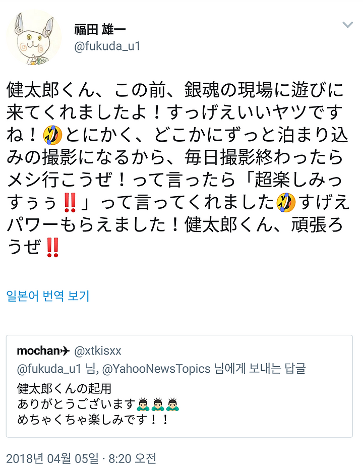 켄타로군, 얼마 전, 은혼의 현장에 놀러 왔어요! 굉장히 좋은 녀석입니다!🤣 아무튼 어딘가에서 계속 밤샘 촬영이 되기 때문에 매일 촬영 끝나면 밥 먹으러 가자! 라고 했더니" 짱 기대입니다 ‼ ️"라고 해주었습니다 🤣 엄청나게 파워 받았습니다! 켄타로 군, 힘내자 ‼ ️ https://t.co/jNLQgaWR5g