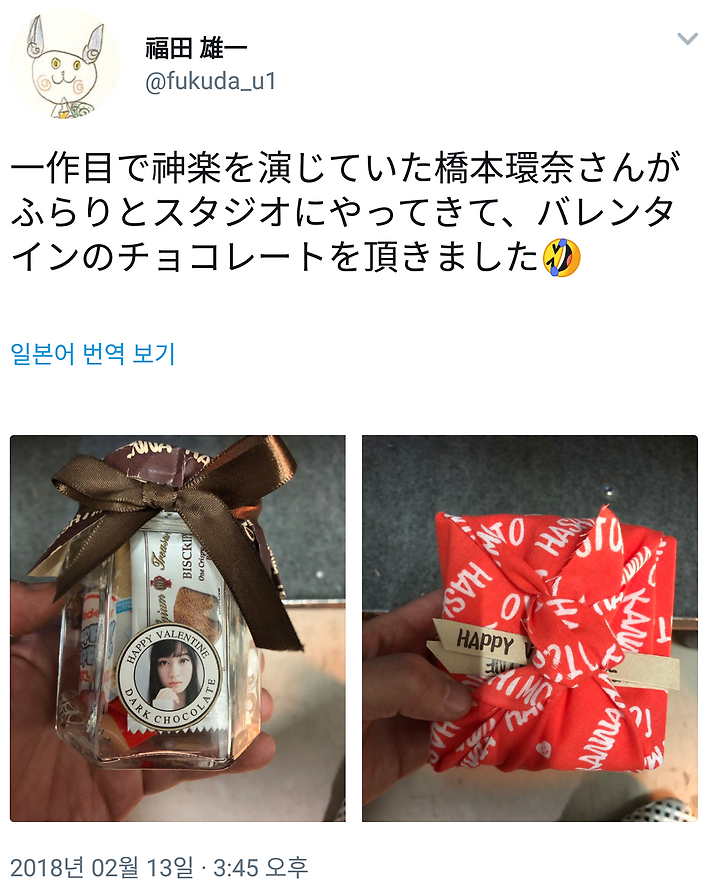 一作目で神楽を演じていた橋本環奈さんがふらりとスタジオにやってきて、バレンタインのチョコレートを頂きました🤣 https://t.co/1hplpbEjeU