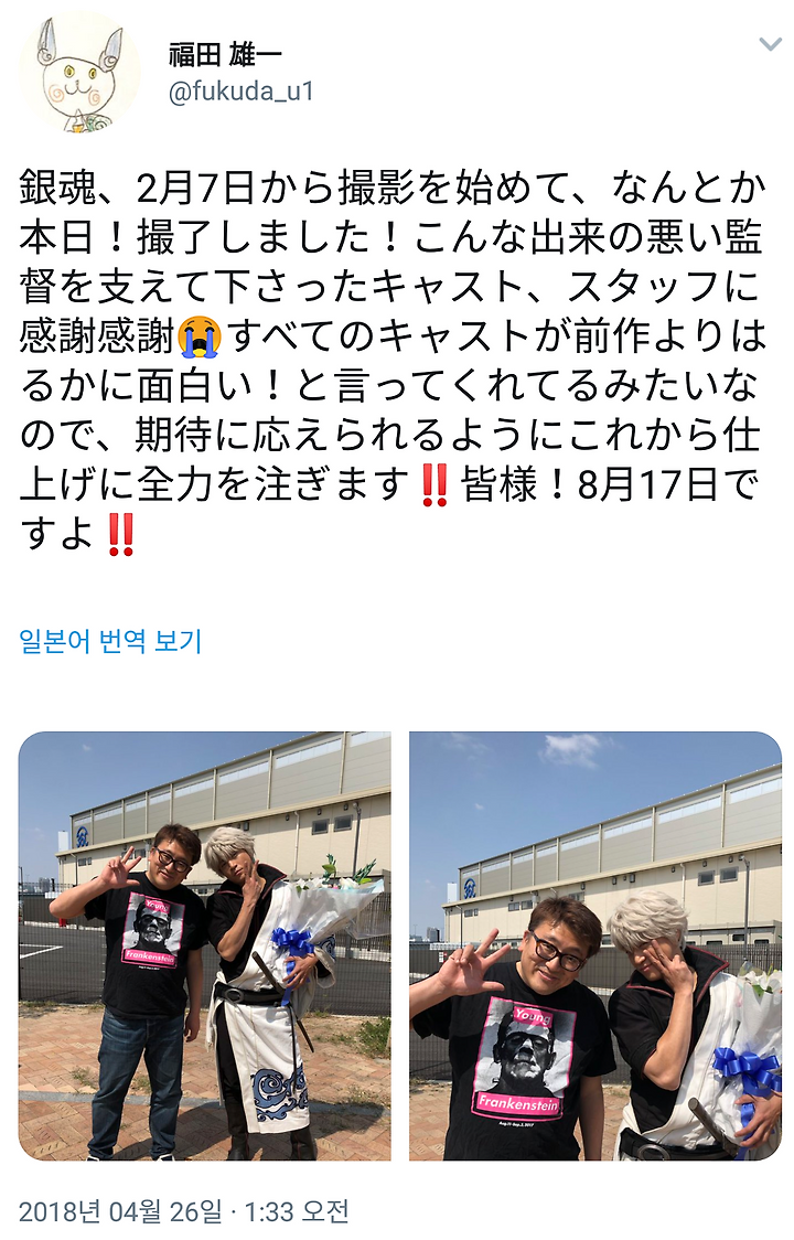 銀魂、2月7日から撮影を始めて、なんとか本日!撮了しました!こんな出来の悪い監督を支えて下さったキャスト、スタッフに感謝感謝😭すべてのキャストが前作よりはるかに面白い!と言ってくれてるみたいなので、期待に応えられるようにこれから仕上げに全力を注ぎます‼️皆様!8月17日ですよ‼️ https://t.co/DgLXJQ1Fdz