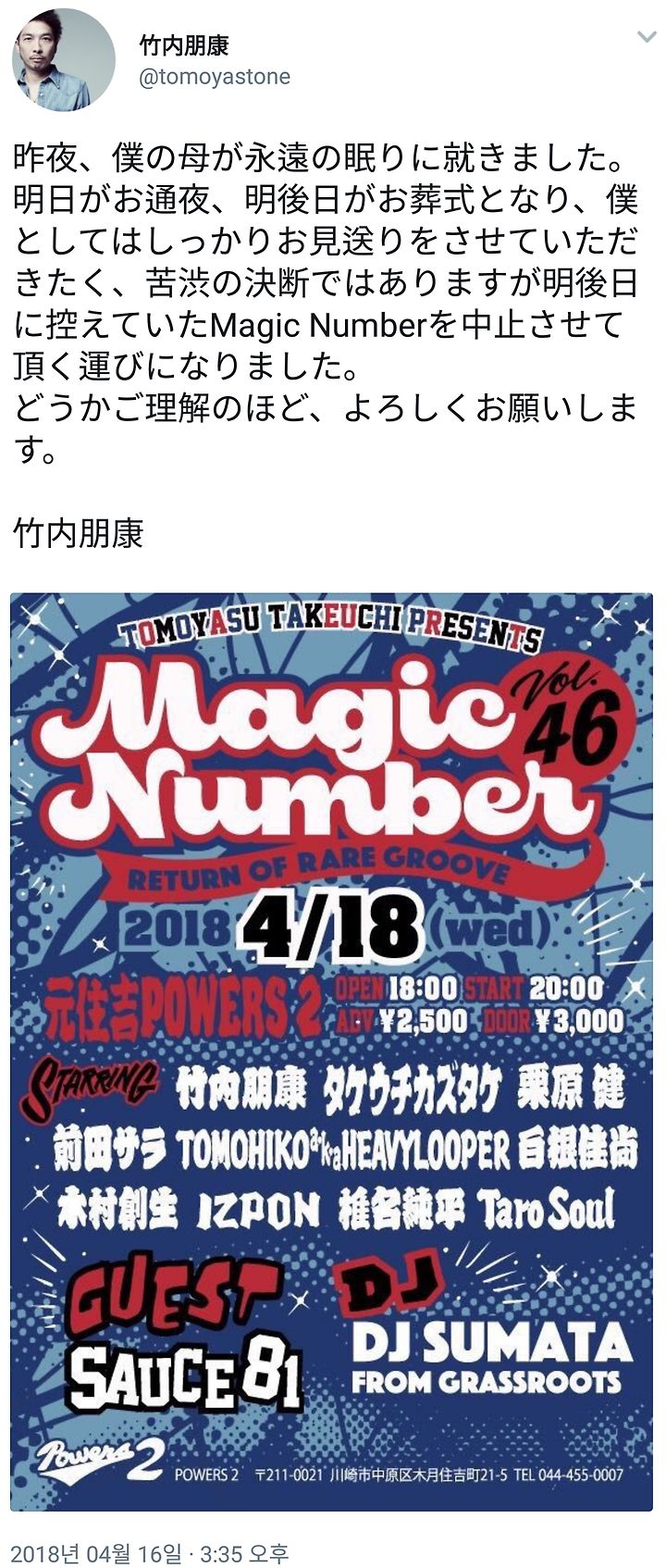 昨夜、僕の母が永遠の眠りに就きました。明日がお通夜、明後日がお葬式となり、僕としてはしっかりお見送りをさせていただきたく、苦渋の決断ではありますが明後日に控えていたMagic Numberを中止させて頂く運びになりました。