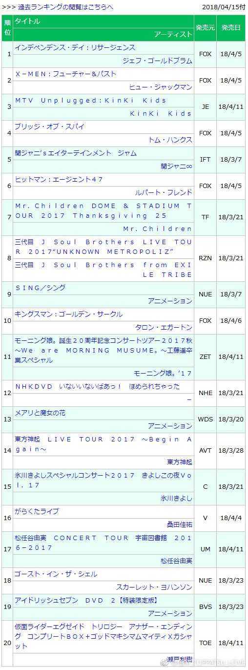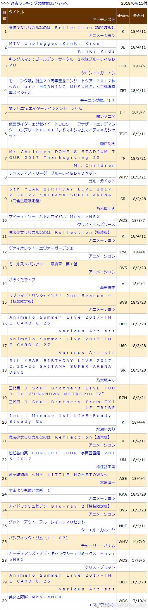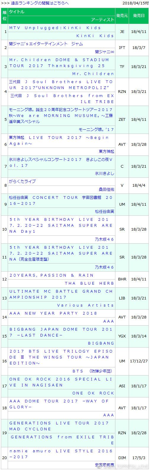 [KinKi Kids] 4/15 오리콘 DVD/Blu-ray 데일리 랭킹 : MTV Unplugged 1위