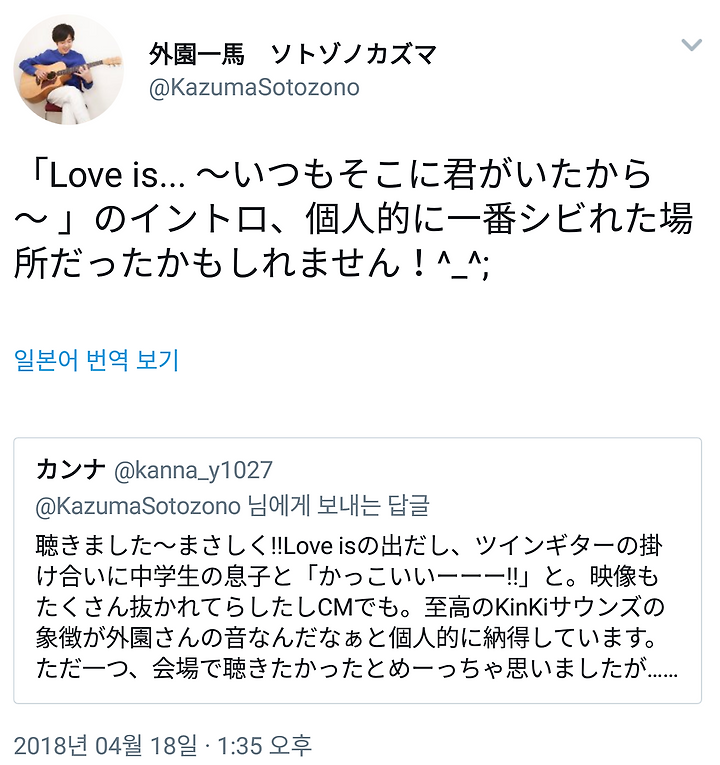 들었습니다~ 딱 바로‼ Love is의 시작, 트윈 기타의 주고받음에 중학생 아들과 " 멋있어---‼" 라고. 영상도 많이 비쳤고 CM에서도. 최고의 KinKi사운드의 상징이 소토조노씨의 소리이구나 하고 개인적으로 납득하고 있습니다. 단 한가지, 현장에서 듣고 싶었다고 엄청 생각해버렸습니다만 😢