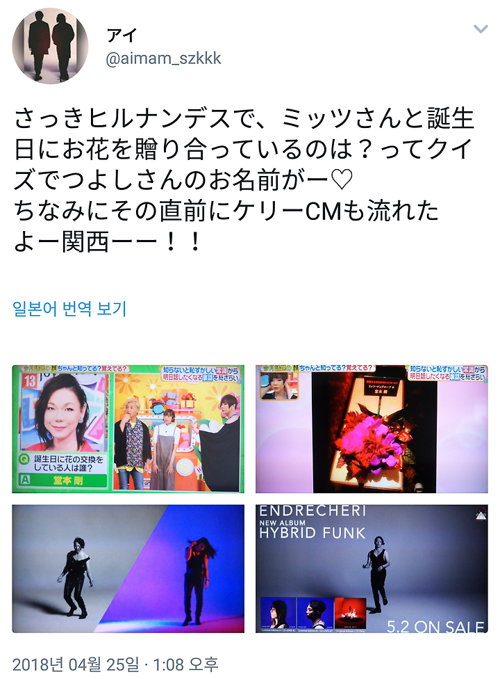 그 CM 후에 "밋츠상과 생일에 꽃을 교환하고 있는 것은?"이라는 퀴즈에서 도모토 쯔요시 왔다. ㅋㅋㅋ