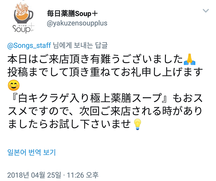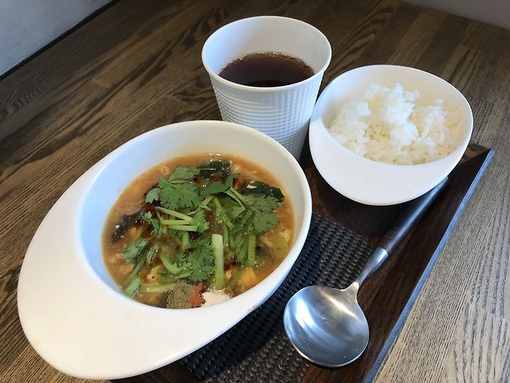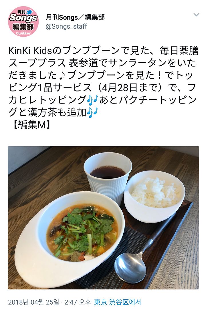 KinKi Kids의 붕부붕에서 본 매일 약선 스프+오모테산도에서 산라탕을 먹었습니다 ♪ 붕부붕을 봤어요!로 토핑 1품 서비스(4월 28일까지) 로 상어 지느러미 토핑 🎶 그리고 파쿠치 토핑과 한방차도 추가 🎶