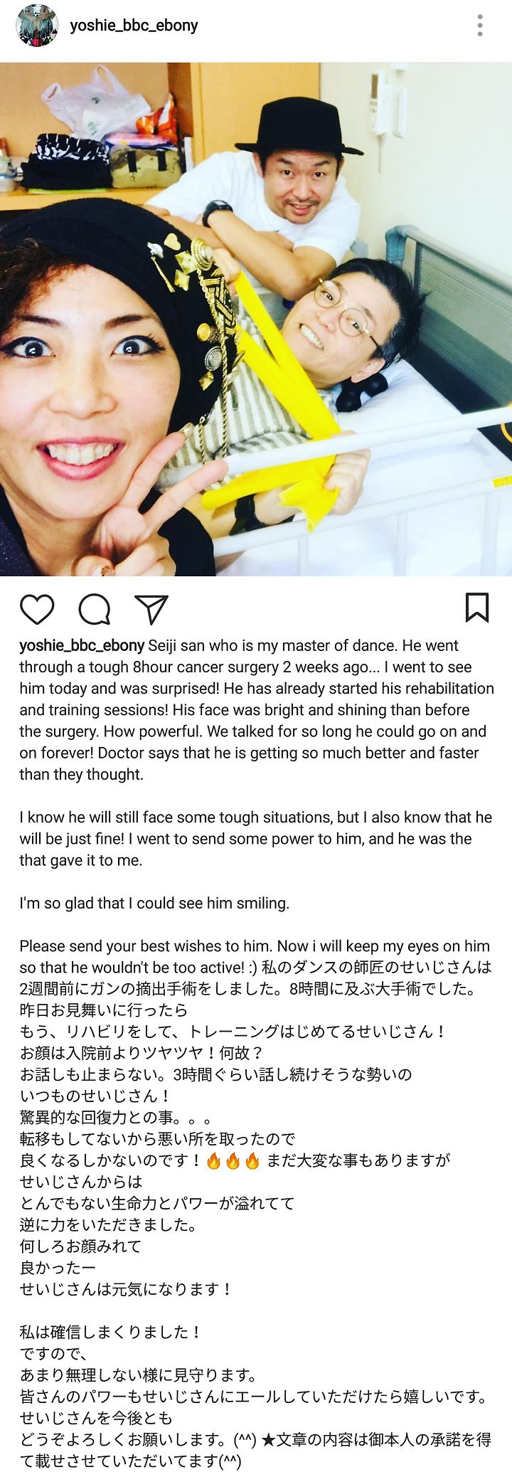 Seiji san who is my master of dance. He went through a tough 8hour cancer surgery 2 weeks ago... I went to see him today and was surprised! He has already started his rehabilitation and training sessions! His face was bright and shining than before the surgery. How powerful. We talked for so long he could go on and on forever! Doctor says that he is getting so much better and faster than they thought.