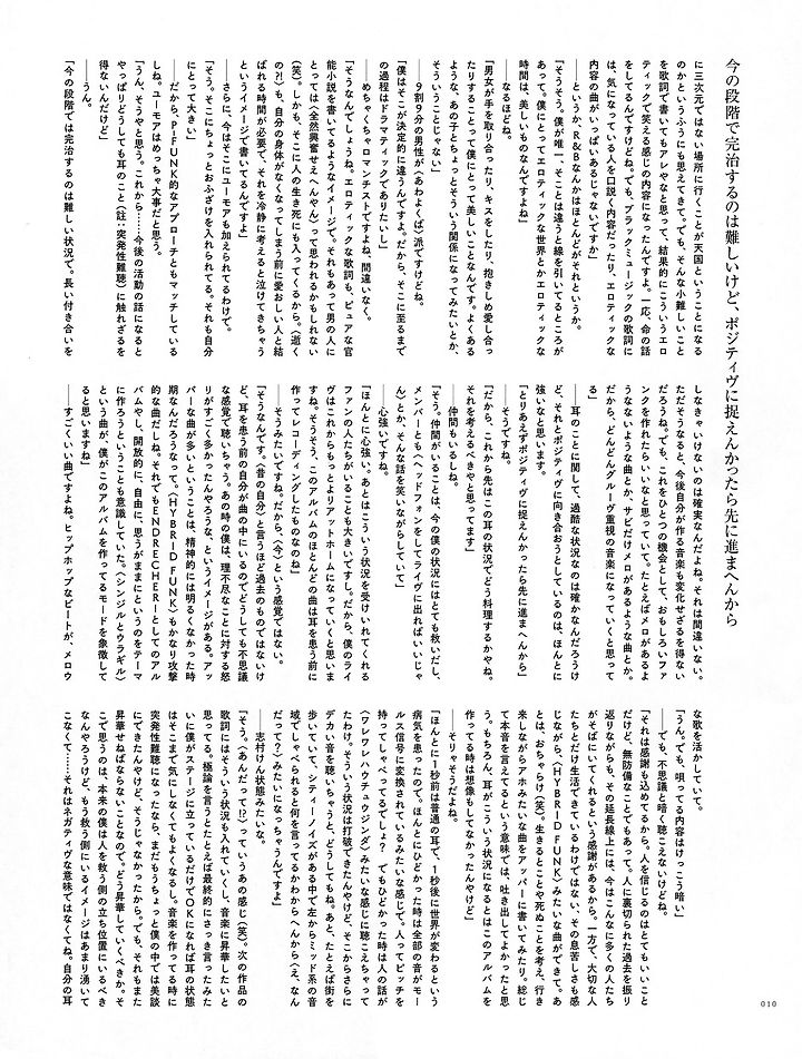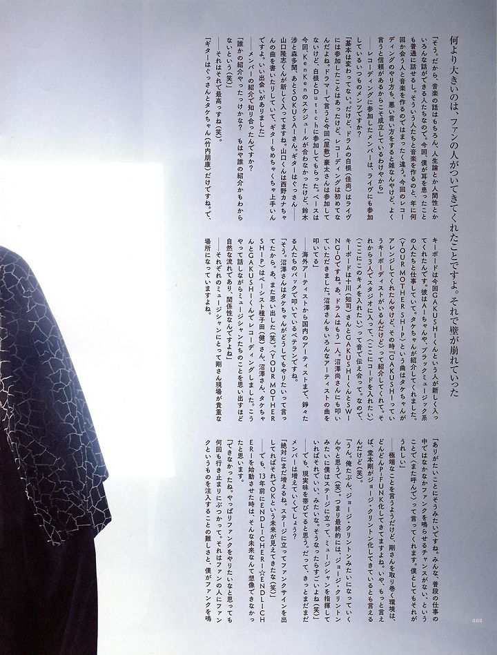 텔레비전에서 음악 세계관을 클로우즈업 해준 적은 있지만 이런 인터뷰처럼 음악에 관련된 인간성이 클로우즈업 된 적은 없어서. 그래서 상층에서 바람은 불고 있지만 대지는 확실히 보이지 않는 느낌으로 나를 파악하고 있는 사람이 정말로 많은. 그러면 아무래도 이미지만이 부풀어져가버리니까 말야. 사실은 이런 인간이 이런 세계를 만들고 있다고 알아주는 것이 순서라고 생각하지만 계속 세계 쪽이 선행되어버리고 있으니까. 하지만 지금은 이제 뭐, 다 그런 거지 라고 생각하면서 긍정적으로 <내버려둬줘>라고 생각하고 있어요. 그러면 일상 생활도 점점 심플하게 되어가네요. 원래 많은 사람과 뭉치는 느낌도 아니었고. 소중한 사람과 깊은 사이로 있으면 되기 때문에.