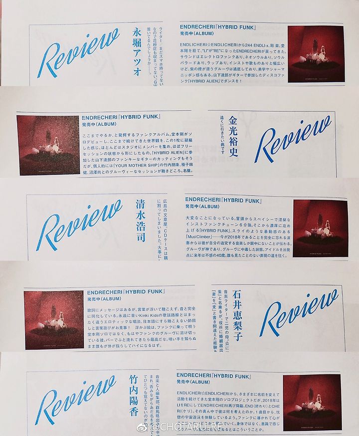 작품과 라이브를 반복할 때마다 도모토 쯔요시의 음악 표현의 양상이 점점 P-FUNK화 되어오고 있는데 오랜만이지만 ENDRECHERI 명의로 약 2년만에 릴리즈하는 이 『HYBRID FUNK』라고 하는 뉴 앨범은 그 정수라고 할 수 있을 지도 모르겠다. 신뢰하는 뮤지션들과의 세션을 축으로 만들었을 것이라는 것을 다이렉트하게 느낄 수 있는 농후, 또한 농밀한 라이브감으로 가득찬 사운드. 사랑과 생명과 죽음이라고 하는 그에게 있어서 영원불변의 테마가 축으로 존재하면서 유머러스한 에토티시즘도 곳곳에 살려 언어의 그루브라고 하는 것을 중시한 가사. 그리고 자유로운 폼으로 약동하는 노래. 그것이 삼위일체가 된 악곡군에 접하니 지금의 그가 매우 릴랙스된 상태로 Funk 뮤직의 강점인 묘미를 전력으로 맛보고 있다는 것을 잘 알 수 있게 되었다. 다만, 본작의 수록곡의 대부분은 그가 돌발성 난청을 앓기 전에 완성된 것이기 때문에 도모토 쯔요시의 현재를 있는 그대로 반영하고 있는가 한다면 그것은 아니다. 하지만 이 인터뷰를 읽으면 알 수 있을 것이라고 생각하지만 지금의 그는 과거 최고로 터프한 마인드로 음악 인생을 구가하려고 하고 있다.