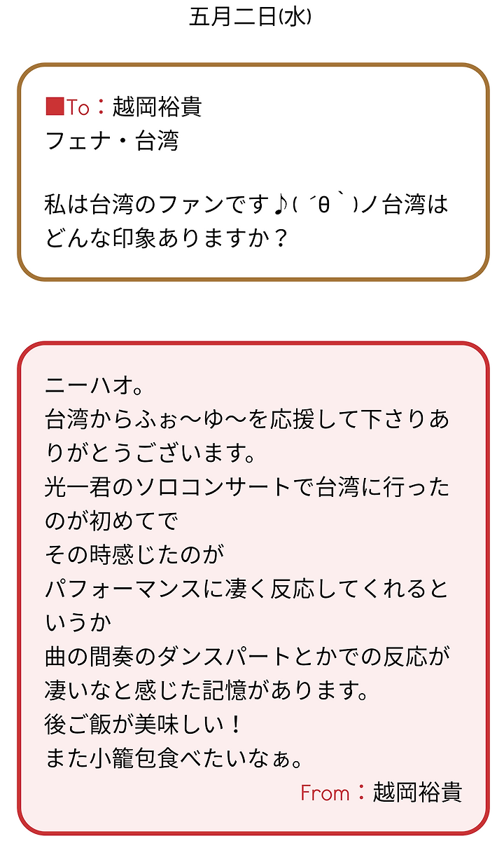 코이치군의 솔로 콘서트로 대만에 갔던 것이 처음으로 그 때 느꼈던 것이 퍼포먼스에 매우 반응해주신다고 할까 곡의 간주 댄스 파트 같은 데서의 반응이 굉장하구나 라고 느낀 기억이 있습니다.