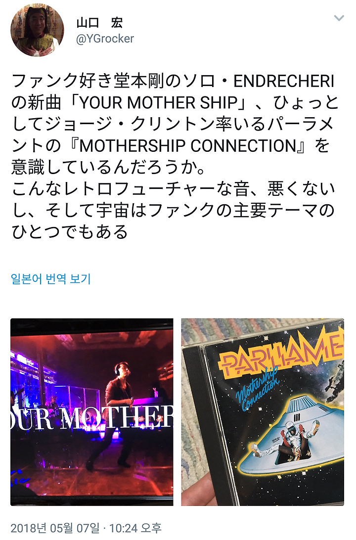 Funk 애호가 도모토 쯔요시의 솔로 ENDRECHERI의 신곡 "YOUR MOTHER SHIP", 혹시 조지 클린턴이 이끄는 팔러먼트의 『MOTHERSHIP CONNECTION』을 의식하고 있는걸까?