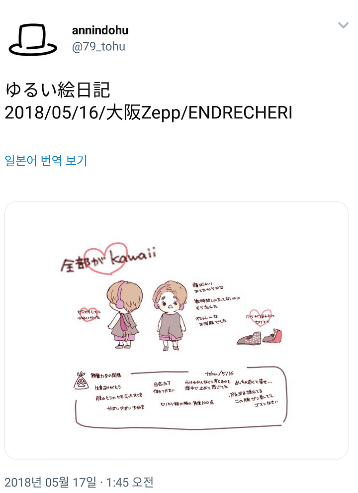 기본적으로 쇼니치와 같고 어제는 상의만 바뀌었는데 검정색 낙낙한 민소매에 가슴선&옆구리 부위에 넘실 거리는 프릴 디자인 들어가 있고