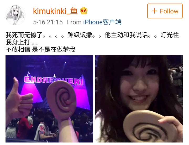 我死而无憾了。。。。神级饭撒。。他主动和我说话。。灯光往我身上打……