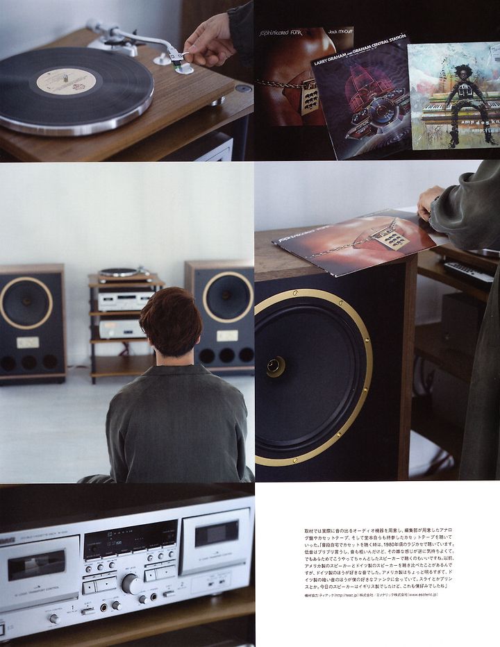 「평소 자택에서 카세트를 들을 때는 1980년경의 라디오 카세트로 듣고 있습니다. 저음은 툭툭 거리고 소리도 거칠지만 그 꾸밈없는 느낌이 반대로 기분 좋아서. 하지만 다시 한 번 이렇게 제대로된 스피커로 듣는 것도 좋네요. 이전, 아메리카제의 스피커와 독일제의 스피커를 배교해서 들은 적이 있습니다만 독일제 쪽이 좋은 소리가 났습니다. 아메리카제는 조금 너무 밝아서 독일제의 어두운 소리 쪽이 제가 좋아하는 Funk에 어울렸던. 슬라이라든가 프린스라든가. 오늘의 스피커는 이탈리아제였습니다만 이것도 제 취향이네요」