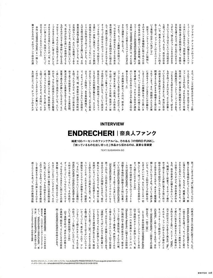 ─ 근년 Funk뮤직에 경도하여 그 사운드를 적극적으로 도입한 작품을 계속해서 탄생시키고 있는 도모토 쯔요시. 얼마 전 릴리즈된 ENDRECHERI 명의에 의한 신작 『HYBRID FUNK』는 그런 그의 Funk에 대한 사랑과 리스펙트를 쏟아 넣은 농후한 한 장이 되었다.