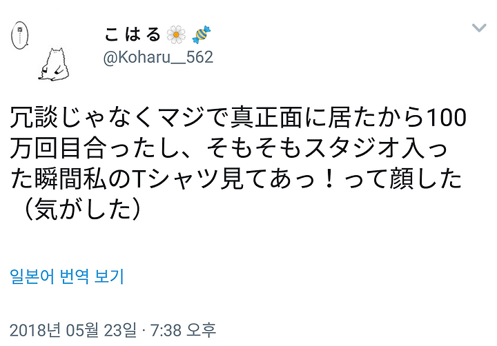 冗談じゃなくマジで真正面に居たから100万回目合ったし、そもそもスタジオ入った瞬間私のTシャツ見てあっ!って顔した(気がした)