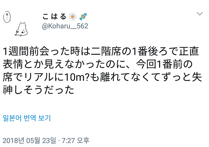 1주일 전 만났을 때는 2층석의 가장 뒤여서 솔직히 표정같은 건 보이지 않았는데 이번에 가장 앞자리여서 리얼하게 10m?도 떨어져 있지 않아서 계속 실신할 것 같았다