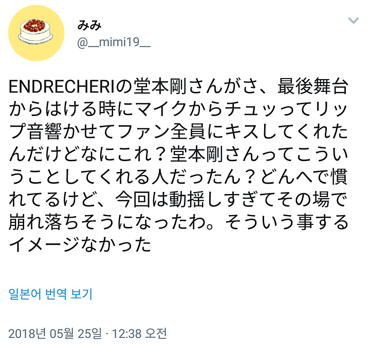 ENDRECHERI의 도모토 쯔요시씨가 마지막 무대에서 들어갈 때 마이크로 츄~라며 입술 소리 울리며 팬들에게 키스했는데 뭐야 이거? 도모토 쯔요시씨란 이런 거 해주는 사람이었어? 동해(슈쥬인듯?)로 익숙해져 있지만, 이번은 너무 동요해서 그 자리에서 쓰러질 뻔했어. 그런 걸 하는 이미지 없었거든