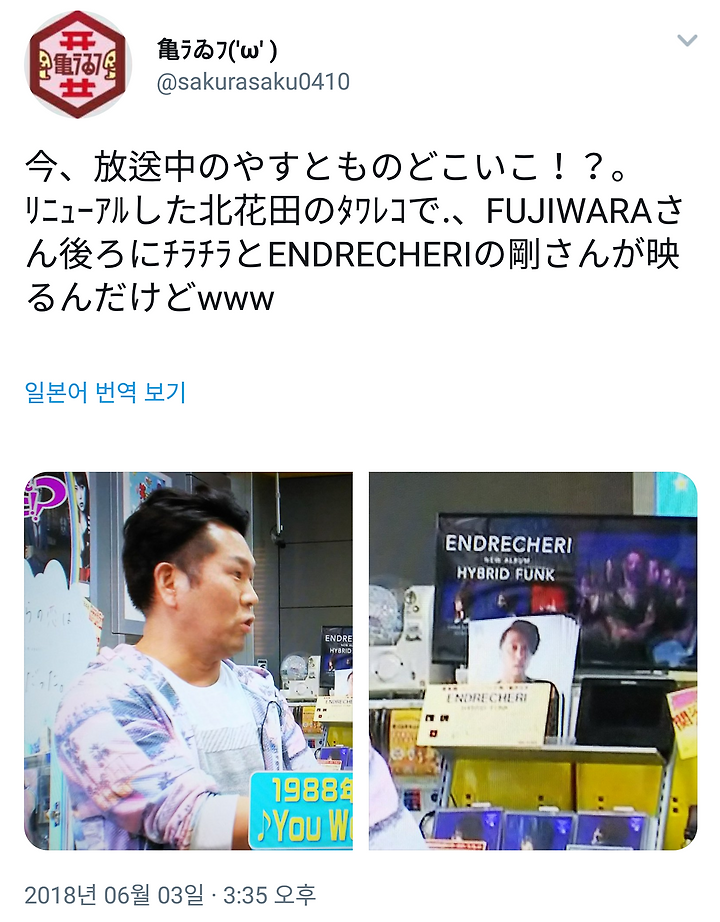 리뉴얼한 키타하나다의 타워 레코드에서. FUJIWARA씨 뒤에 흘끗흘끗 ENDRECHERI의 쯔요시상이 비치는데 말이지 www