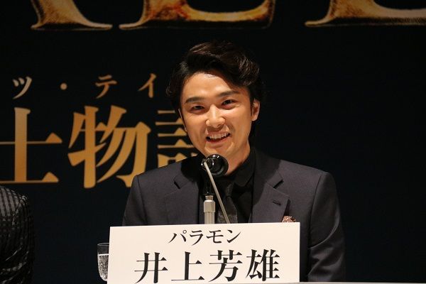 井上 井上芳雄です。この作品は24日に顔合わせがあったのですが、僕はその足でニューヨークに飛びまして、トニー賞をレポートしてくるという仕事がありまして、まだ全く稽古に参加できておらず、帰ってきたばかりなので、皆さんにも馴染めておらず、非常に感じの悪い人になっています(笑)。なので、これからだなと思っているのですが、でも今こうやって製作発表の場を設けて頂き、こうして皆さんとご一緒させて頂いて、本当にやるんだな、現実になるんだなということを感じております。僕はパラモンという騎士の役をやりますけれども、光一君とは従兄弟同士の騎士で、二人は親友でありライバルであるという役柄です。色々なことが起こってくるのですが、僕が唯一稽古に出られた顔合わせの日にジョンが言ったのは「彼らはお互いに、お互いのことを羨んでお互いになりたいと思っている。だからこそ信頼もするし、いがみ合うこともある」というのを聞いた時に、僕は光一君になりたいとか、そんな大それたことは思ったことがないですけれども、どこかではスゴイな、良いなって思っていたのは事実で。僕らが仕事で交わることがあるとは思っていなかったのですが、それが色々な方の力により、こうした形で交わることができたのを、まず第一に嬉しいなと思います。光一君は『SHOCK』を長年続けてきて、これからも現状の活動を続けていかれても何の問題もない成果を納めている方なのですが、そうじゃなくて、1歩新しい、どうなるかわからないところに踏み出してみようと、光一君が思ってくれた、それがすごいことだとなと思います。そこにはリスクもあるだろうし…。
