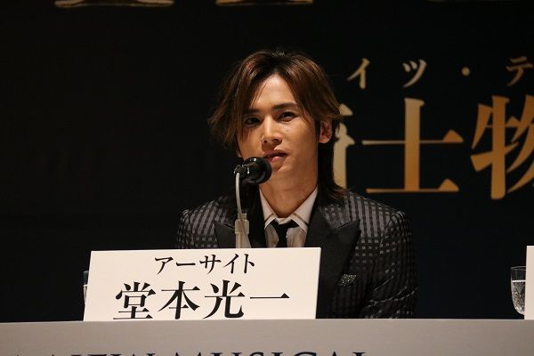 ■ 이노우에: 이노우에 요시오입니다. 이 작품은 24일에 얼굴 인사가 있었습니다만 저는 그 발로 뉴욕에 가서, 토니상을 리포트 하고 온다는 일이 있어 아직 전혀 연습에 참가하지 못하고 막 돌아온 참이기 때문에 모두와도 잘 어울리지 못해 매우 인상이 나쁜 사람이 되어 있습니다ㅎㅎ 그렇기 때문에 이제부터구나, 라고 생각하고 있습니다만, 하지만 지금 이렇게 제작 발표의 장을 만들어 주시고, 이렇게 여러분과 함께 하면서 정말 하는거구나, 현실이 되는 것이구나, 라는 것을 느끼고 있습니다. 저는 파라몬이라는 기사 역을 합니다만, 코이치군과는 사촌 사이의 기사로 두 사람은 친구이며 라이벌이라는 역할입니다. 다양한 일이 일어나는 것이지만 제가 유일하게 연습에 나올 수 있었던 얼굴 인사 날에 존이 말한 것은 "그들은 서로 서로를 부러워하며 상대방이 되고 싶어 하고 있다. 그렇기 때문에 신뢰하고 있고, 으르렁거리기도 한다"라는 것을 들었을 때 저는 코이치군이 되고 싶다든가, 그런 엄청난 일은 생각한 적이 없지만 어디선가는 굉장하네, 좋네, 라고 생각하고 있던 것은 사실이기 때문에. 저희들이 일로 함께할 일이 있을 것이라고는 생각치도 못했는데 그것이 여러 많은 분들의 힘으로 이런 식으로 함께할 수 있게 된 것을 우선 제일로 기쁘다고 생각하고 있습니다. 코이치 군은 『 SHOCK』를 오랫동안 계속해오고 있고 앞으로도 현상의 활동을 이어 가도 아무런 문제도 없는 성과를 내고 계시는 분인데, 그게 아니라 한 걸음 새로운, 어떻게 될지 모르는 곳에 내딛어 보자고 코이치군이 생각하고 준 그것이 대단한 일이라고 생각하고 있습니다. 거기에는 리스크도 있을 것이고...
