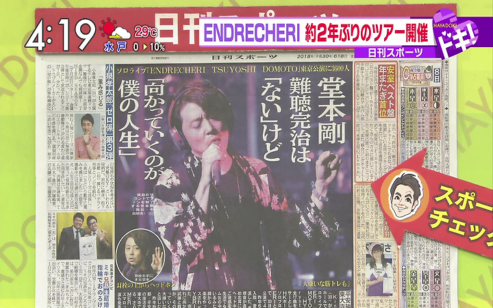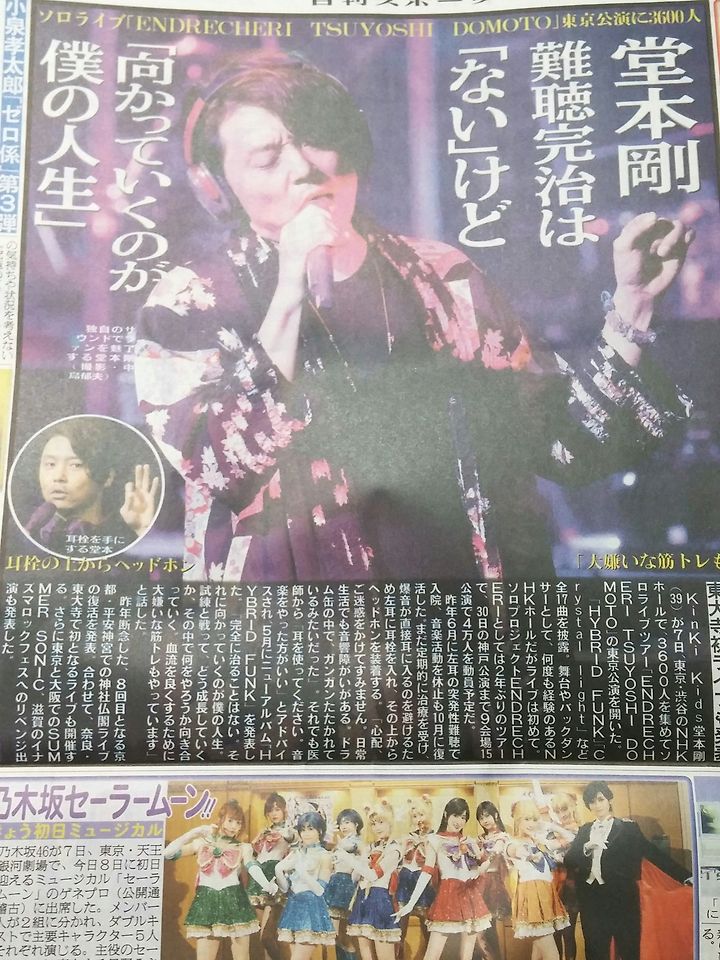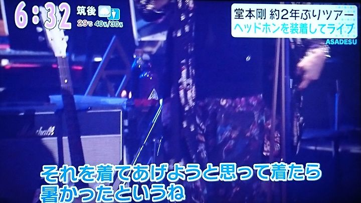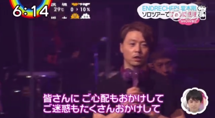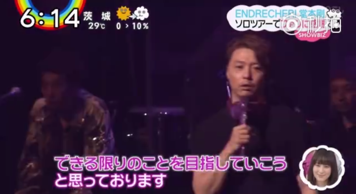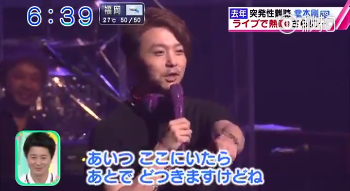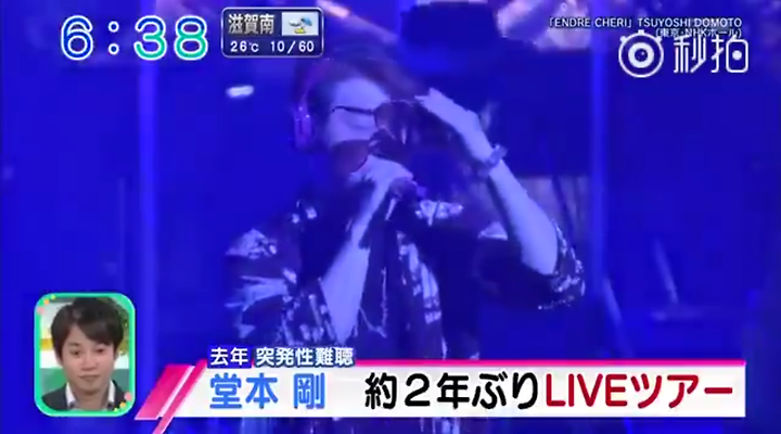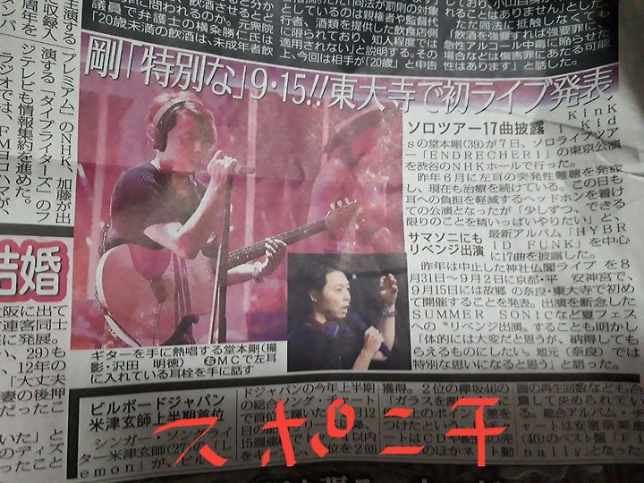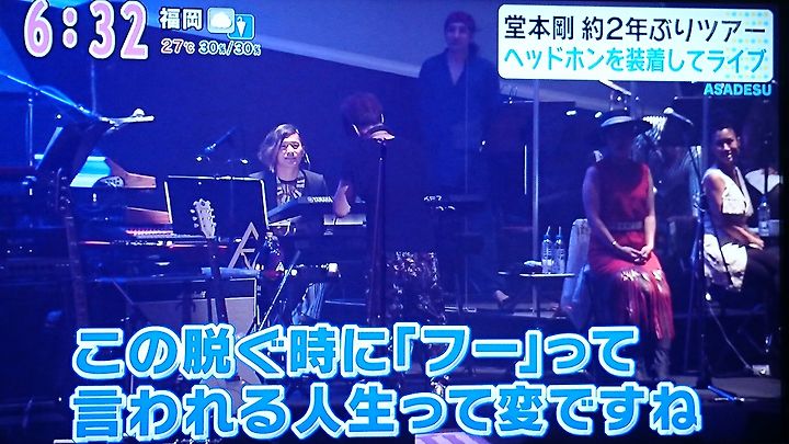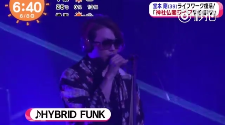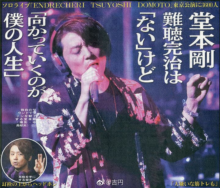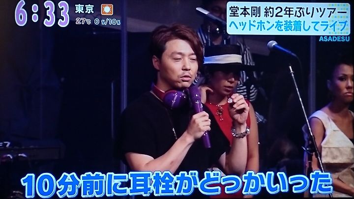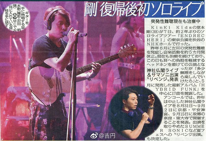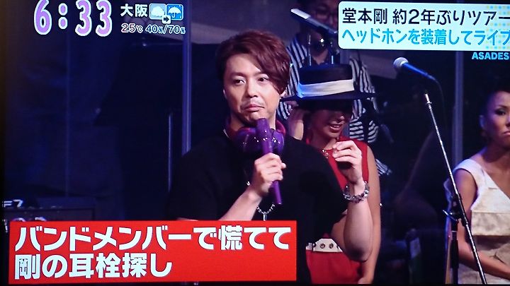 ライブでは耳の状態を考慮してヘッドホンを装着し、「HYBRID FUNK」など十数曲を熱唱。昨年12月のKinKiの公演は、耳がバンドの音に耐えられないため、オーケストラでの演奏だったが、今回はバンド形式での歌唱が可能になるなど、徐々に回復している様子。剛は「しぶとい」と完治には至っていないとしたが、「楽しくできたら」と前を向いていた。