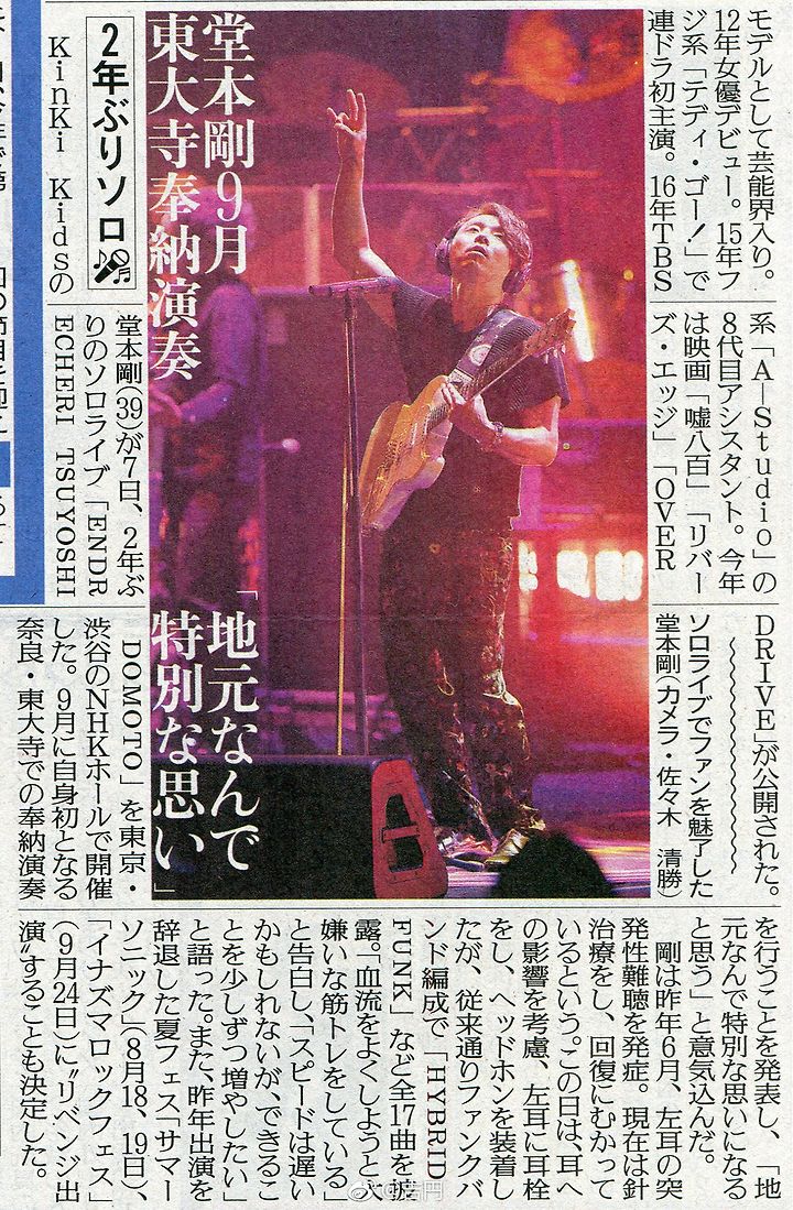 KinKi Kidsの堂本剛(39)が7日、約2年ぶりのソロライブツアー「ENDRECHERI TSUYOSHI DOMOTO」の東京公演をNHKホールで行い、9月15日に故郷・奈良の名刹・東大寺で初ライブを行うことを発表した。