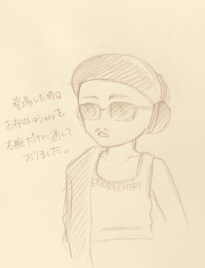 등장 때는 어머니의 셔츠를 오른 팔만 넣어 걸치고 있었습니다.