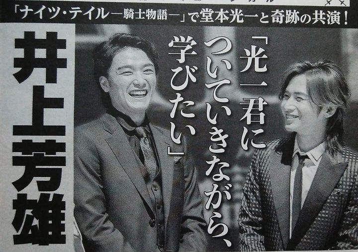 뮤지컬계의 프린스, 이노우에 요시오씨가 표지에! 6월 19일 발매의 선데이 마이니치 7월호에서 이노우에씨가 올 여름 "나이츠 테일-기사 이야기-"에서 첫 팀을 이루는 도모토 코이치씨에 대한 뜨겁게 말하고 있습니다. 화보와 인터뷰로 7 페이지의 대특집. 코이치군의 만면의 미소도 화보로!